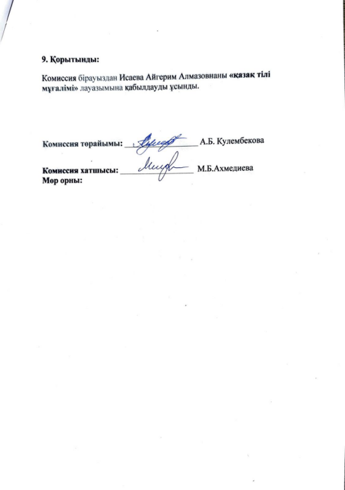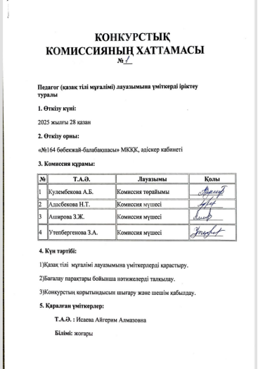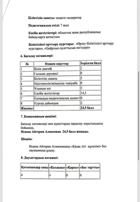"Қазақ тілі мұғалімі" мамандарын конкурс арқылы қабылдау хаттамасы